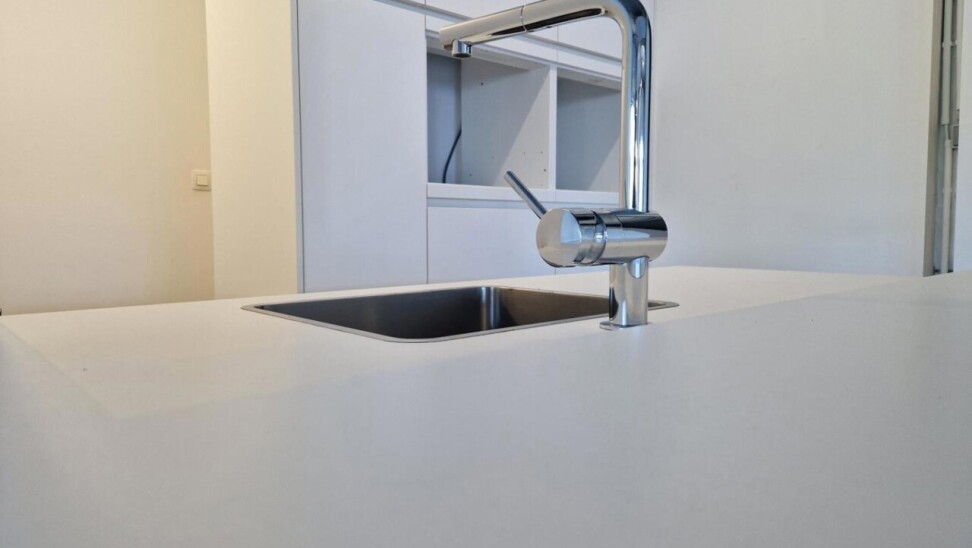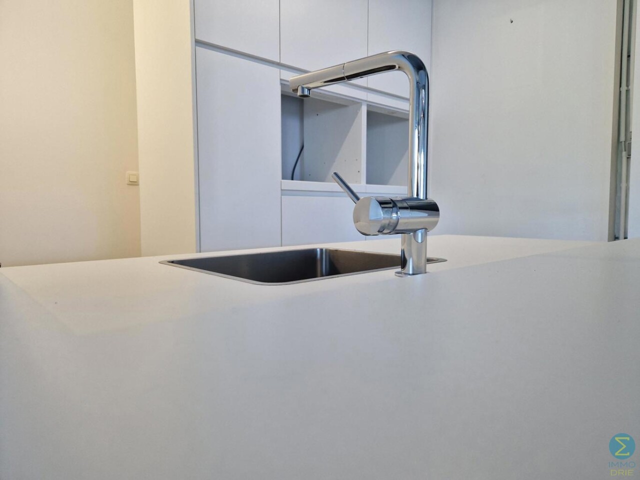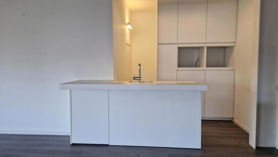 Een open kitchenette, stijlvol afgewerkt, met voldoende kastruimte en voorziening voor oven en koelkast