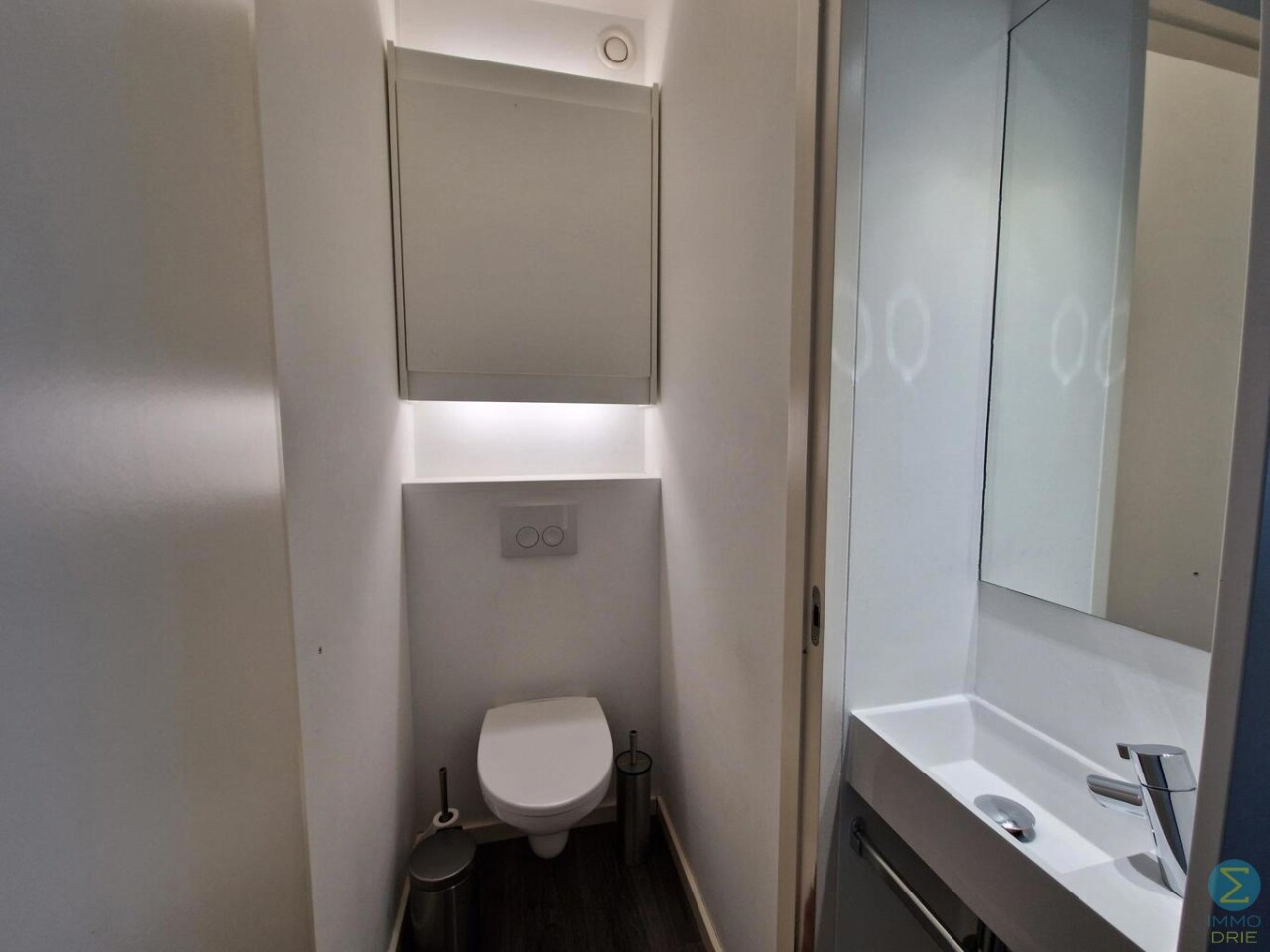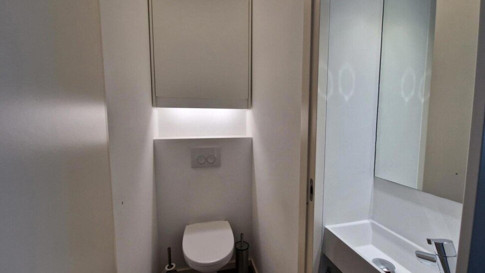 Een afzonderlijk toilet met spoelbak, discreet achter de keuken