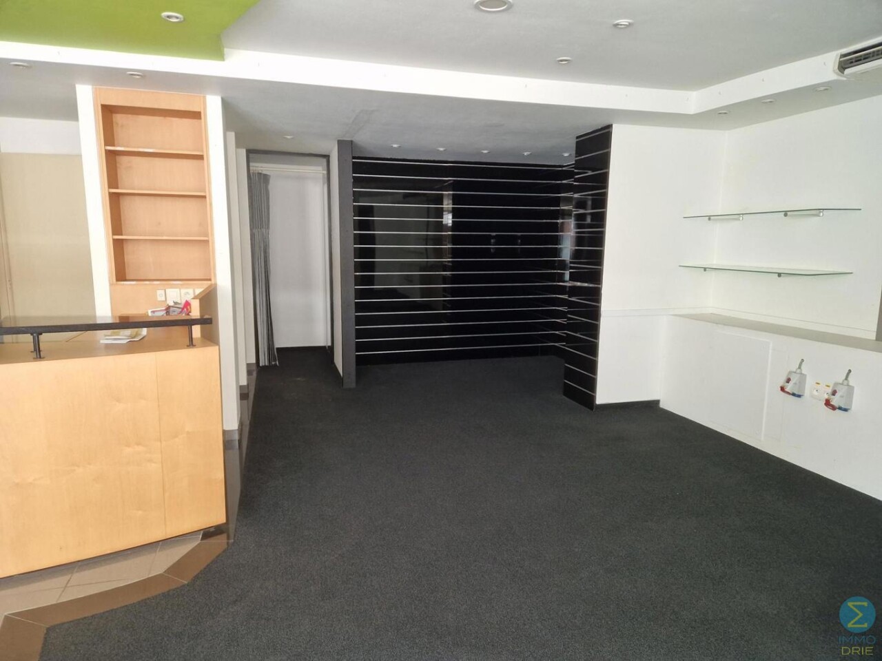 Handelsruimte (momenteel ingericht als schoenenzaak met paskamer), aanpalende grote opslagruimte (magazijn of kantoren), kleine kelder en keukentje. Laden en lossen van klein materiaal langs achter mogelijk.