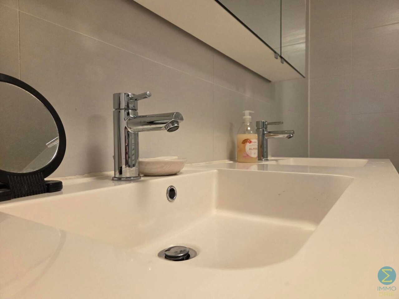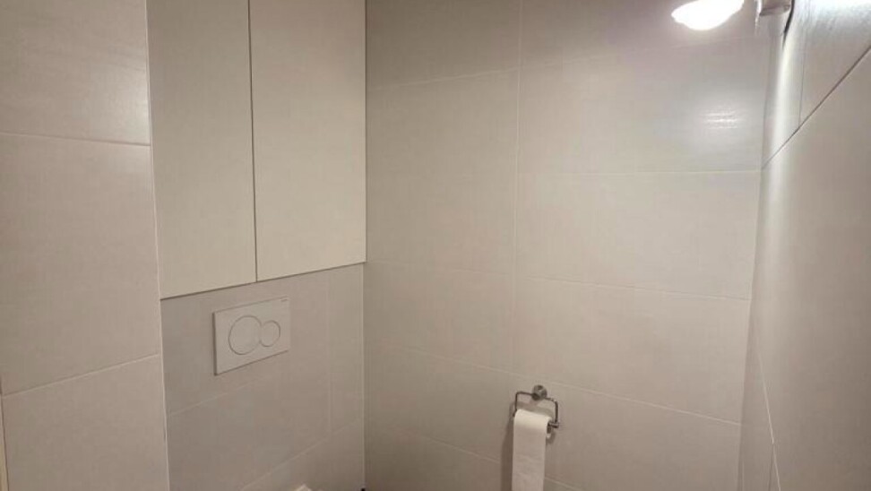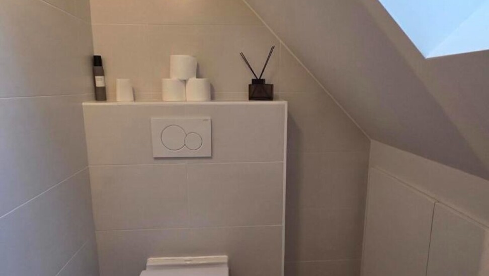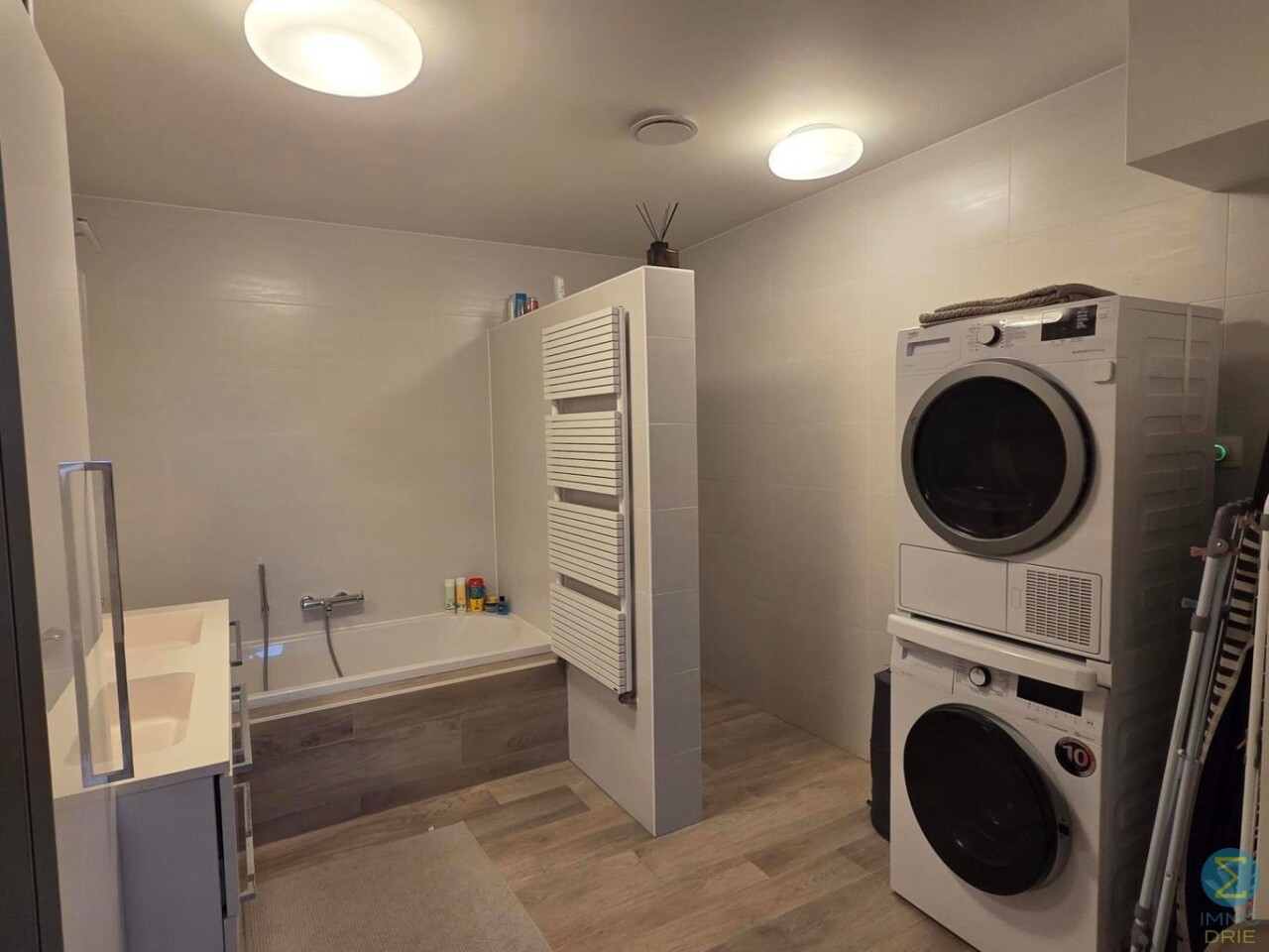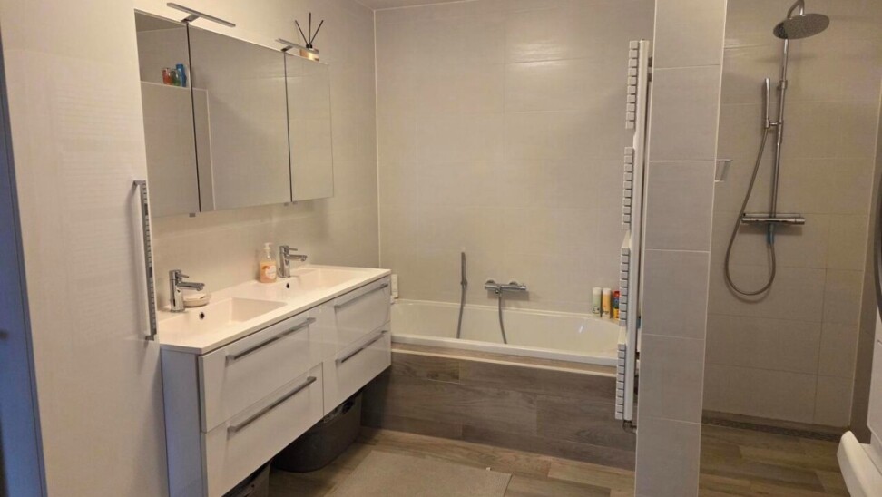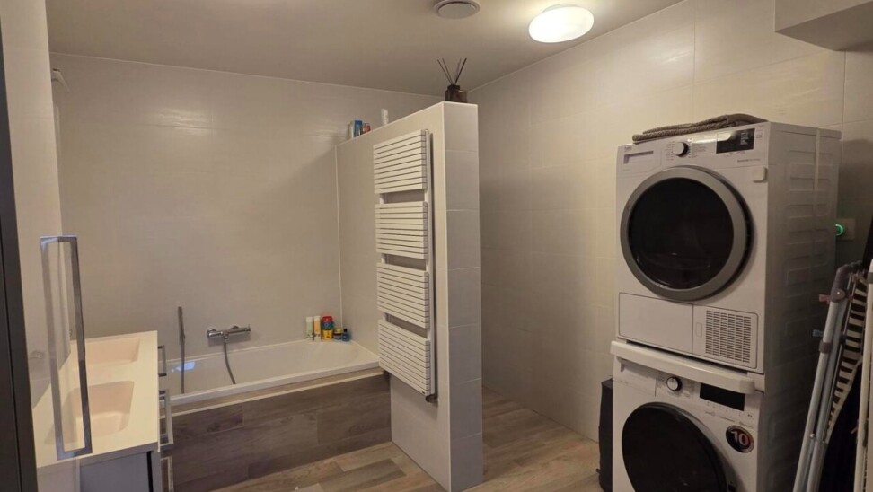 De ruime badkamer is met dezelfde zorgvuldigheid afgewerkt en beschikt over een dubbele wastafel, douche, ligbad, toilet en aansluiting voor wasmachine, waardoor comfort en functionaliteit perfect samengaan.