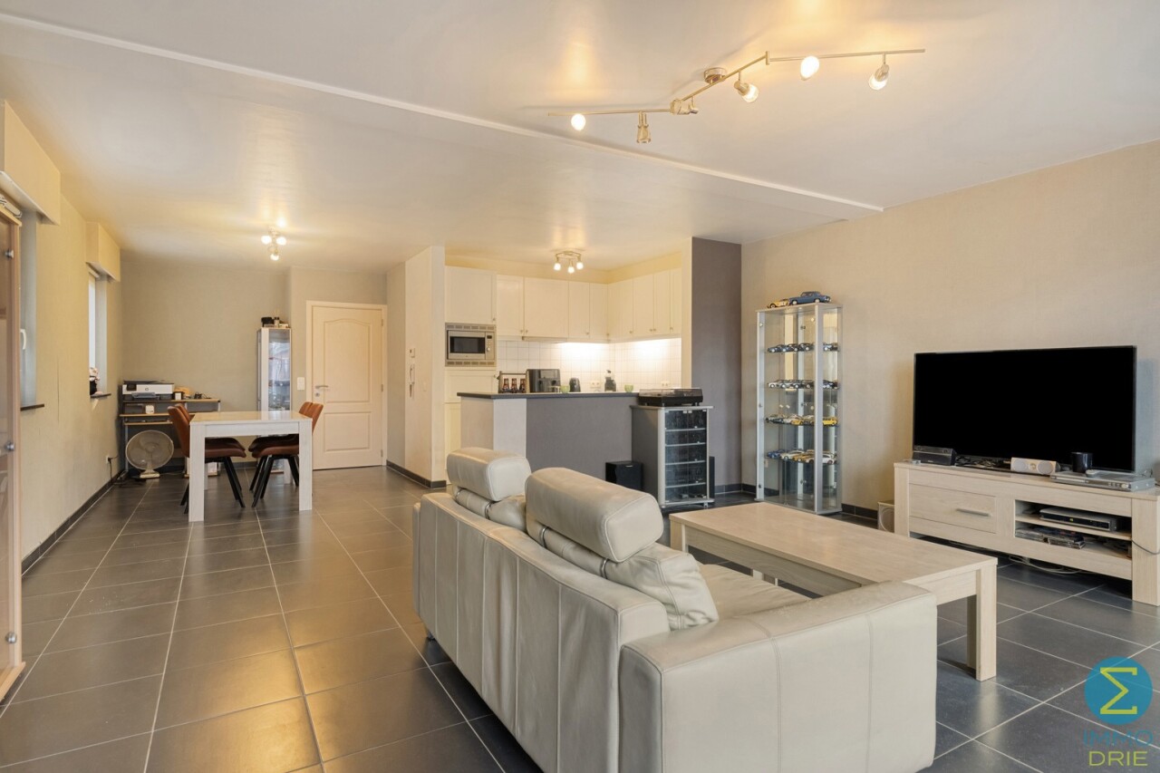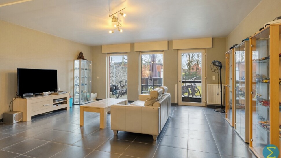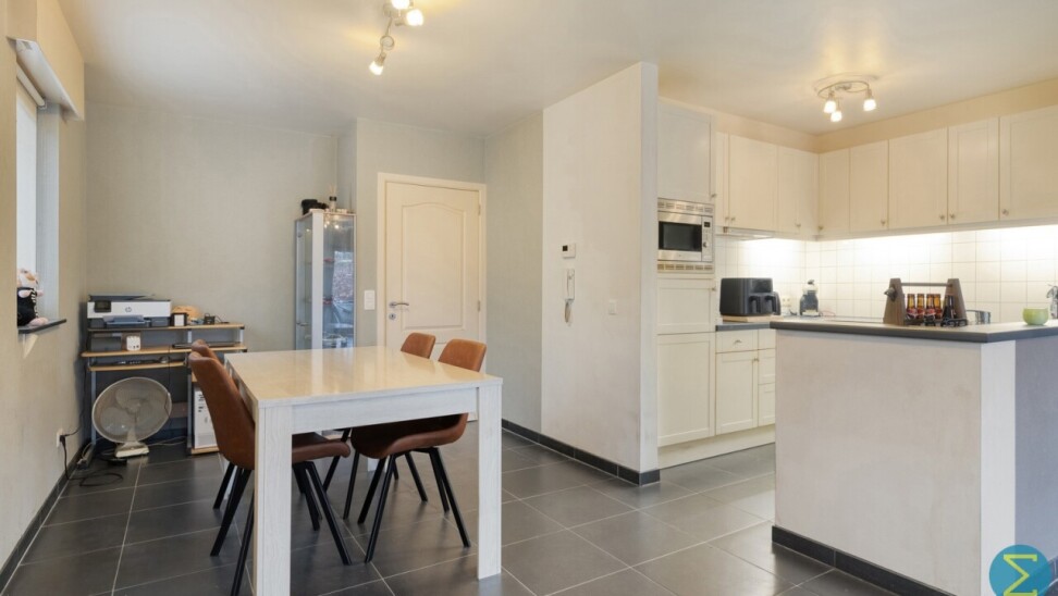 Verder leidt de gang naar de ruime woonkamer met open keuken, die is voorzien van de nodige apparatuur, en achteraan doorgang verschaft naar het terras met afgesloten tuin en poortje, waarlangs men makkelijk de achterliggende garagebox bereikt.