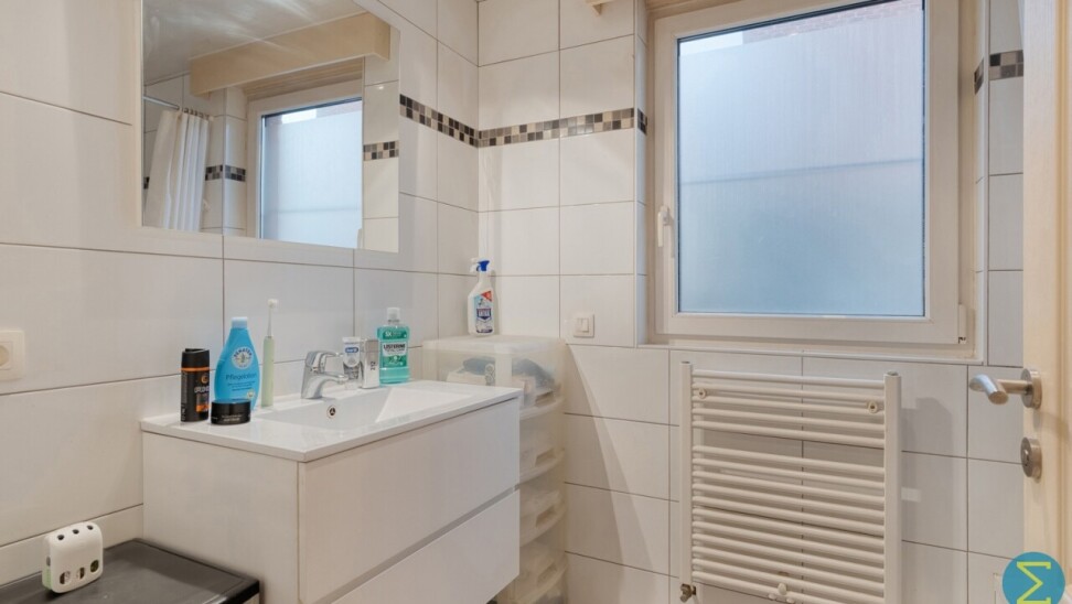 De inkomhal met centrale gang en inbouwkast geeft toegang tot een apart toilet, de slaapkamers dewelke zich aan de straatzijde bevinden, de badkamer met ligbad en wastafelmeubel en de berging/wasruimte.