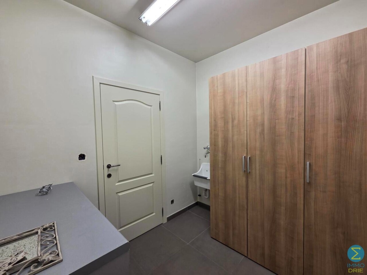 Tussen de garage en de keuken bevindt zich een praktische, ruime wasplaats, voorzien van een wastafel en aansluitingen voor wasmachine en droogkast. De open keuken zelf is volledig uitgerust met een gasvuur, oven, vaatwasser, inbouwkoelkast en voldoende opbergruimte, perfect voor het gezinsleven of voor wie graag kookt.