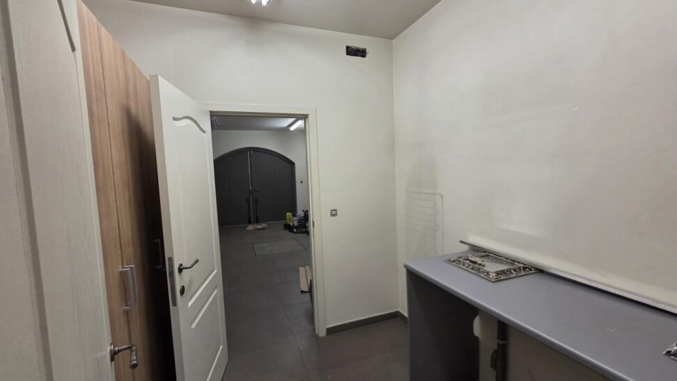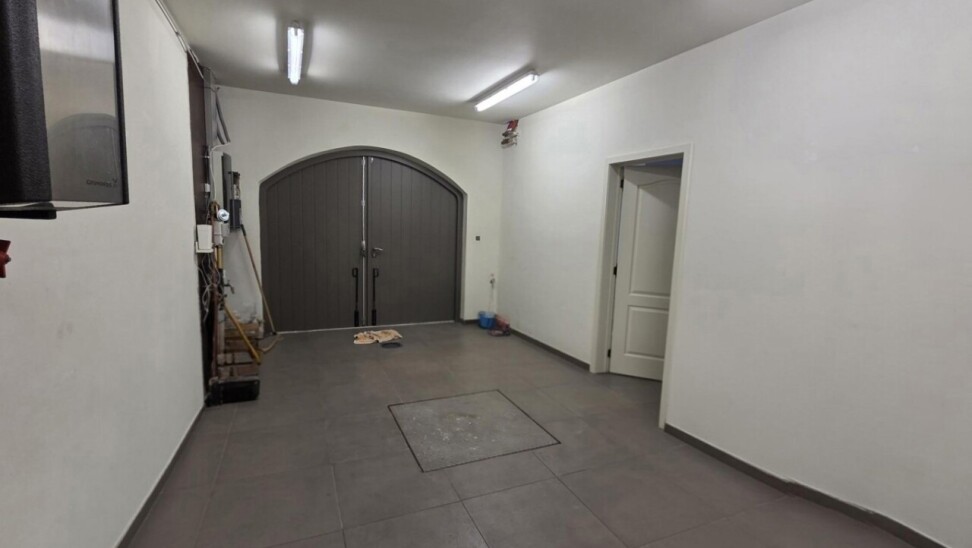 Links bevindt zich een gastentoilet en er is meer dan voldoende plaats voor een grote vestiairekast, ideaal voor jassen, schoenen en alle dagelijkse spullen alsook is er een beperkte bergruimte aanwezig voor eventueel poetsgerief e.d. Vanuit de inkomhal heb je directe toegang tot de open leefruimte of tot de inpandige garage, die is uitgerust met een landelijke dubbele houten deur die manueel te bedienen is.