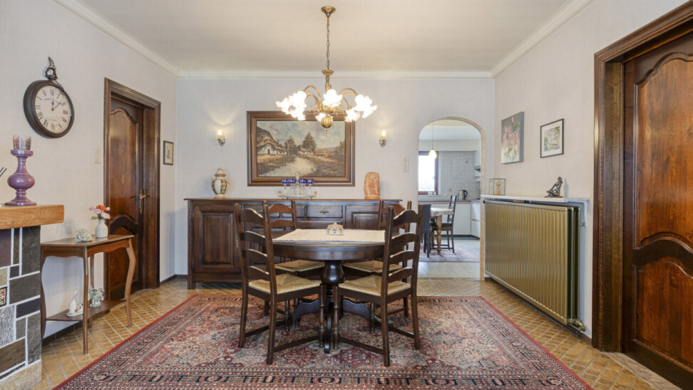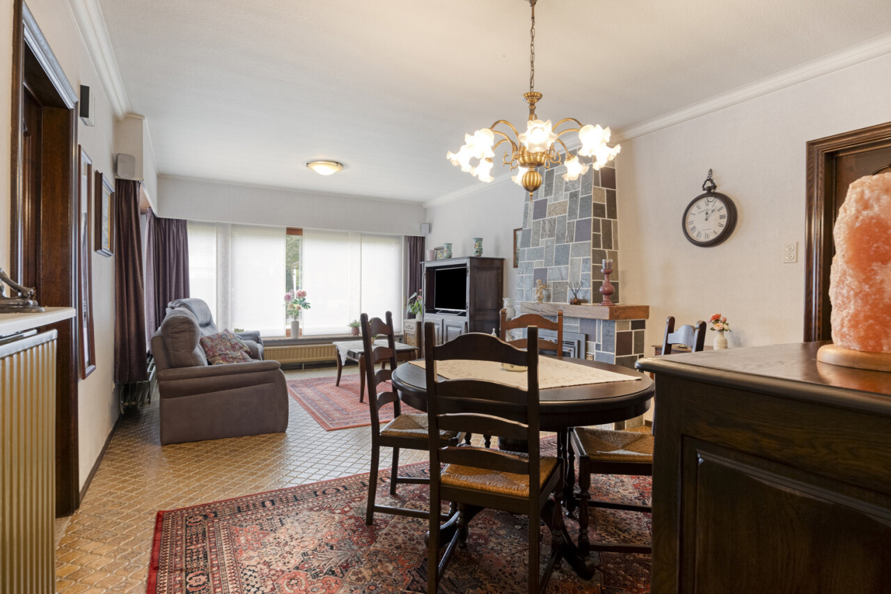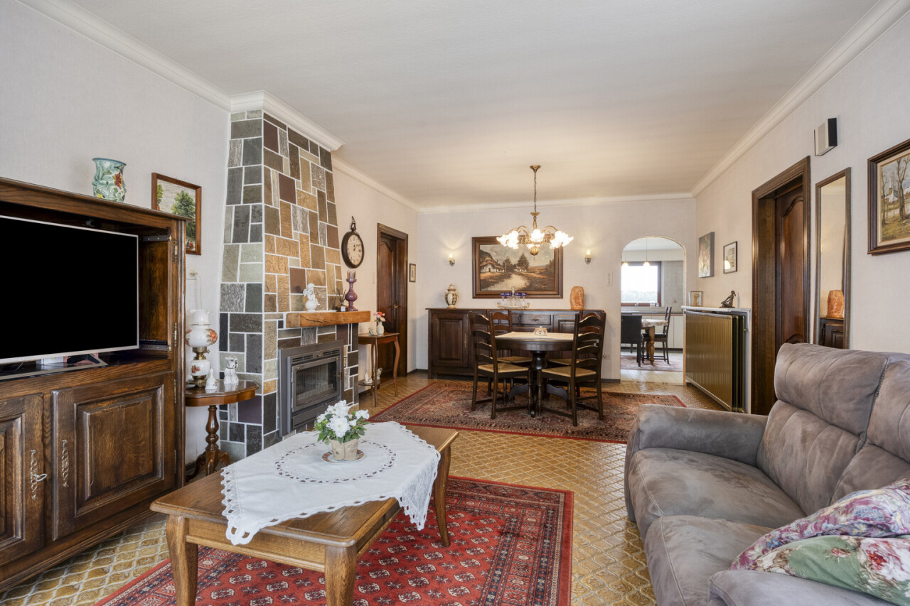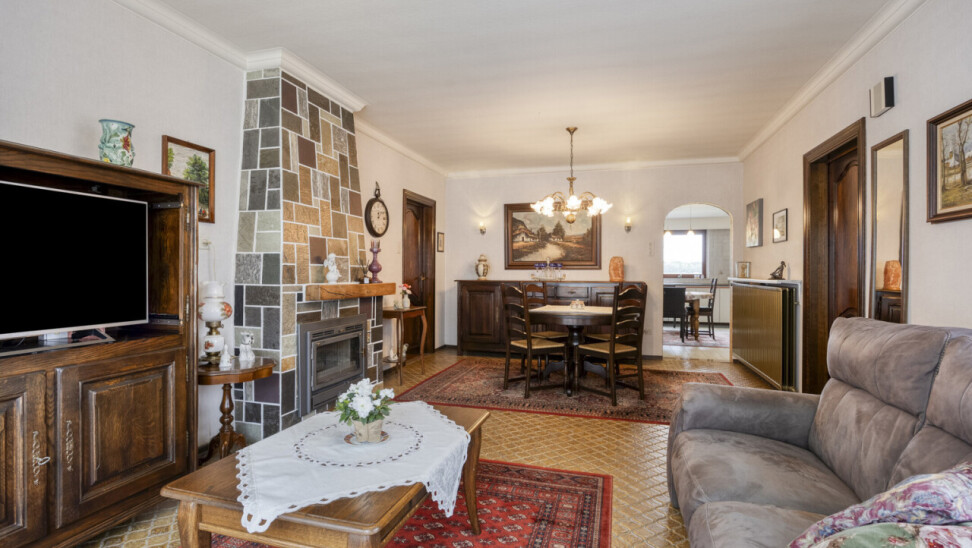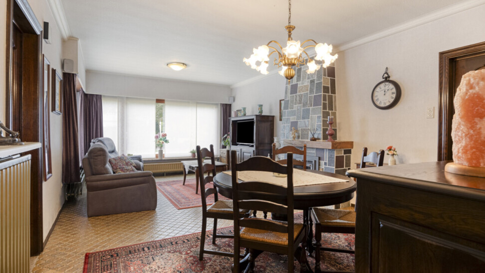 Vanuit de inkomhal betreden we de woonkamer, dewelke verder aansluiting geeft tot de ruime leefkeuken met toegang tot de royale kelder.