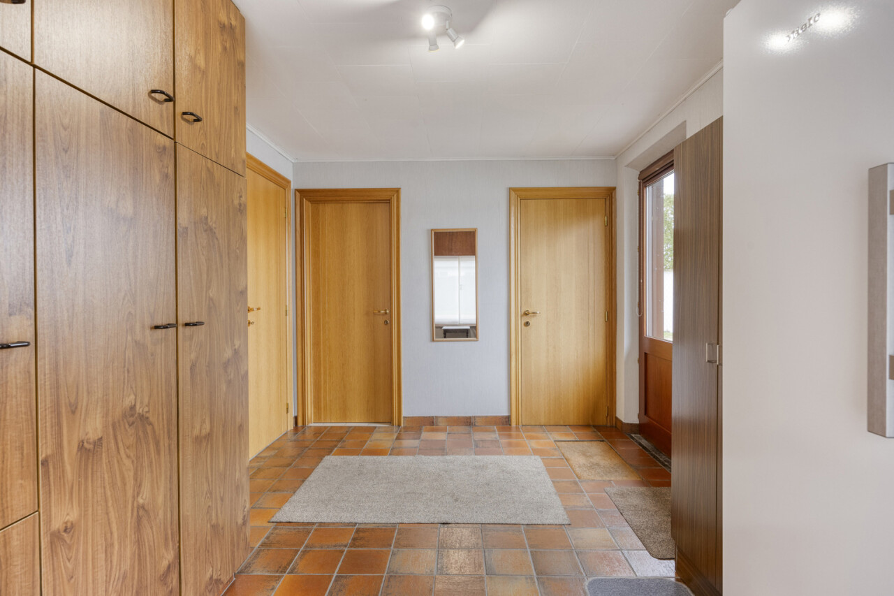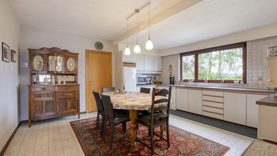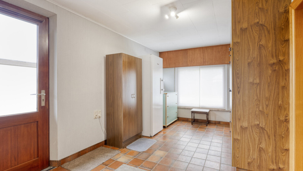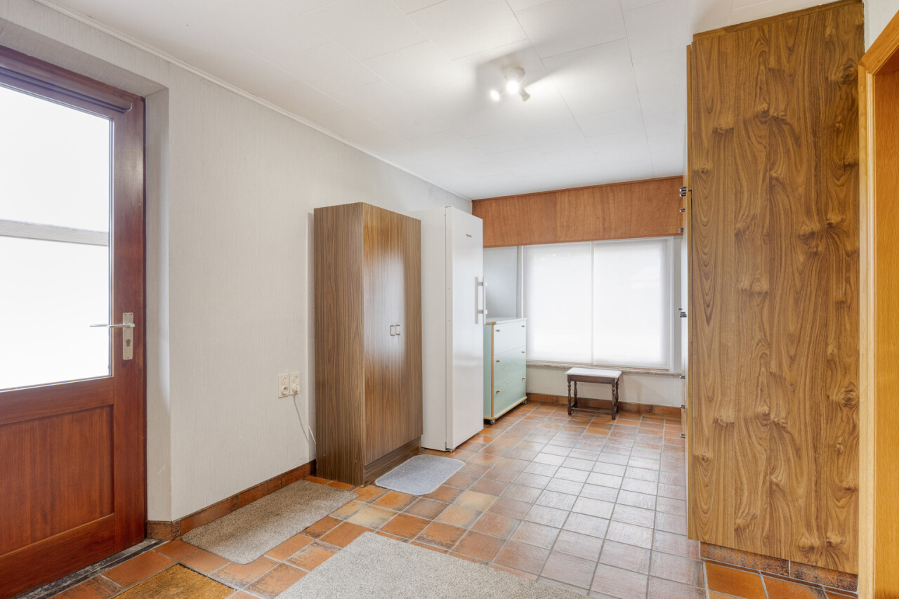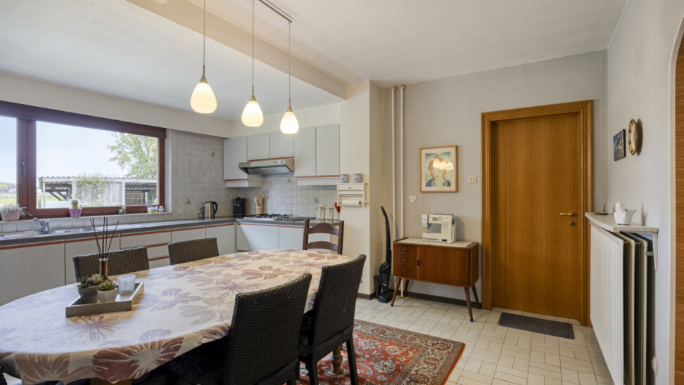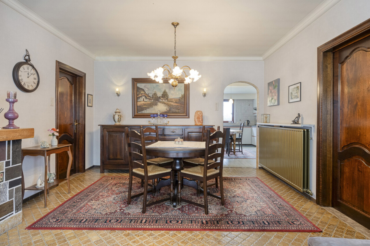 Vanuit de inkomhal betreden we de woonkamer, dewelke verder aansluiting geeft tot de ruime leefkeuken met toegang tot de royale kelder.