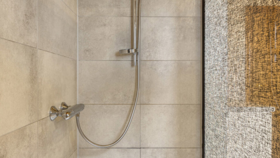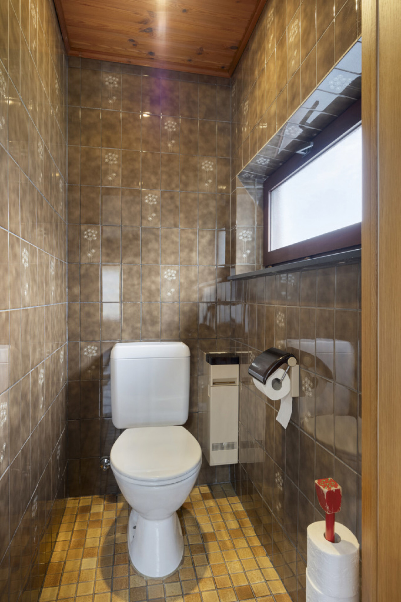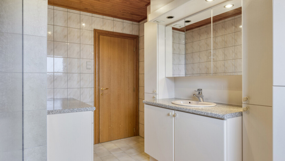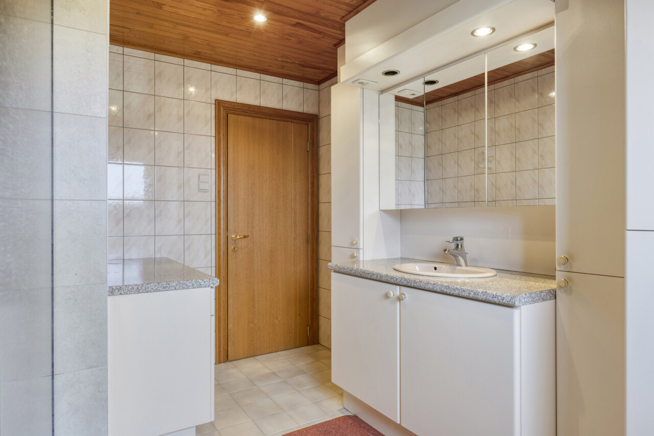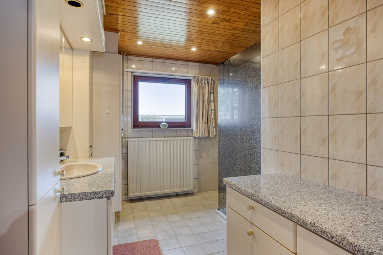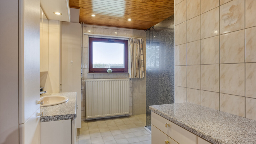 Verder treffen we nog een grote berging met zijingang, een apart toilet en de badkamer, die is uitgerust met een inloopdouche en een wastafelmeubel.