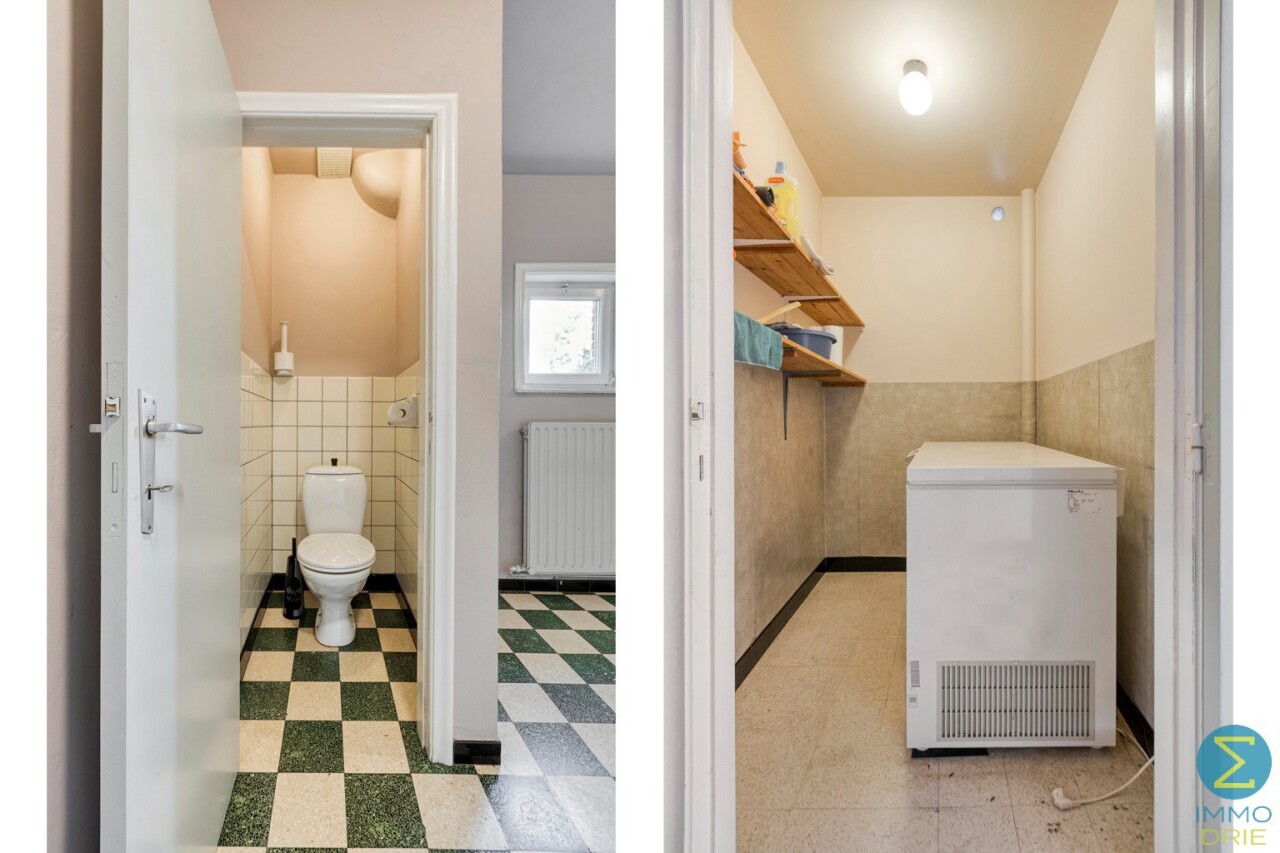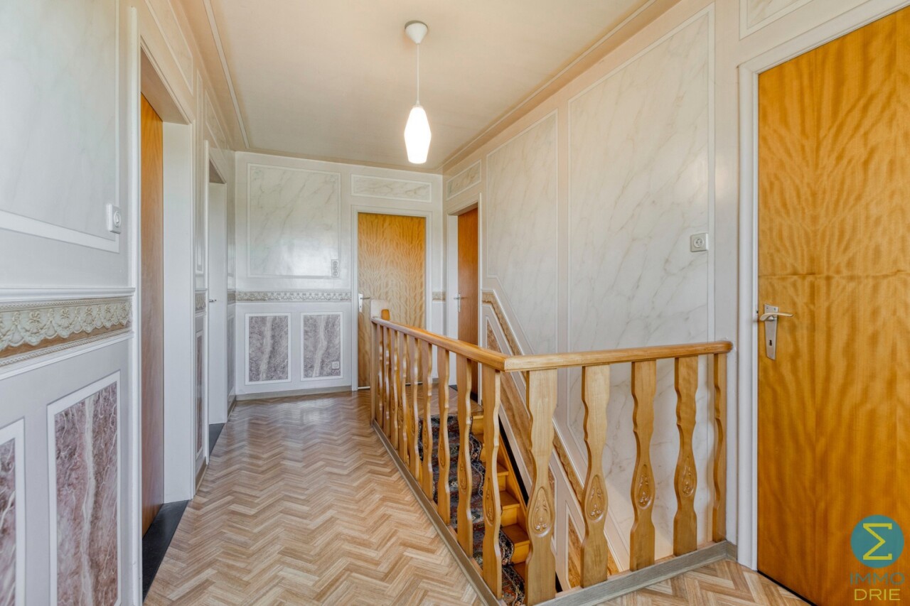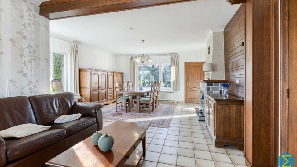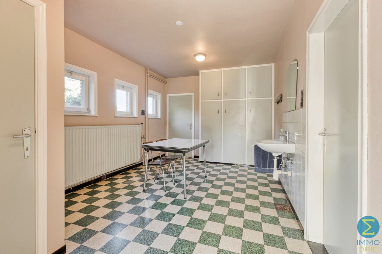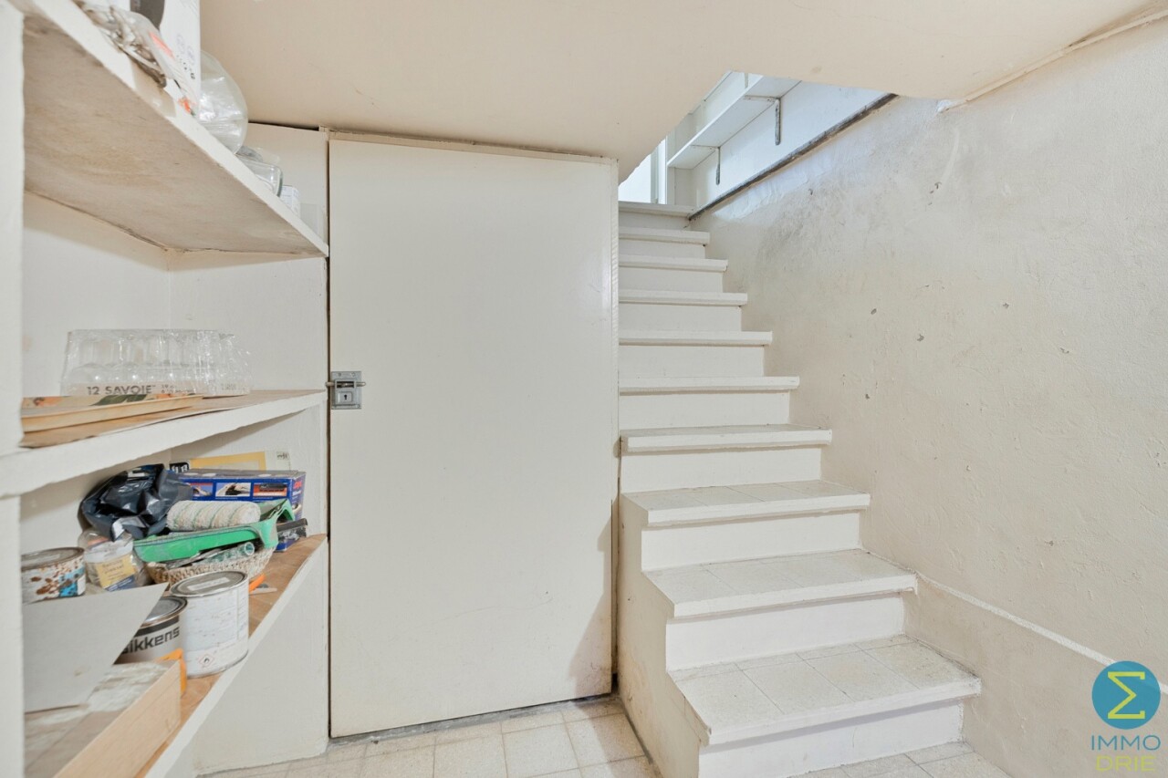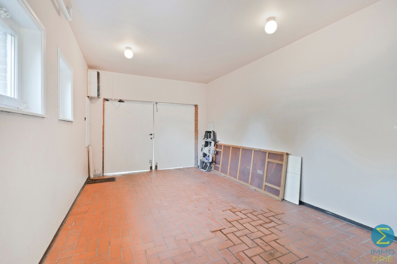 Vanuit de karaktervolle inkomtraphal begeeft u zich naar de ruime woonkamer, dewelke verder aansluit bij de keuken met eethoek en kelder, alsook rechtstreekse doorgang verschaft naar het terras. Vervolgens komt men in de royale berging/wasruimte met apart toilet en achterinkom en bereikt men tevens de inpandige garage.