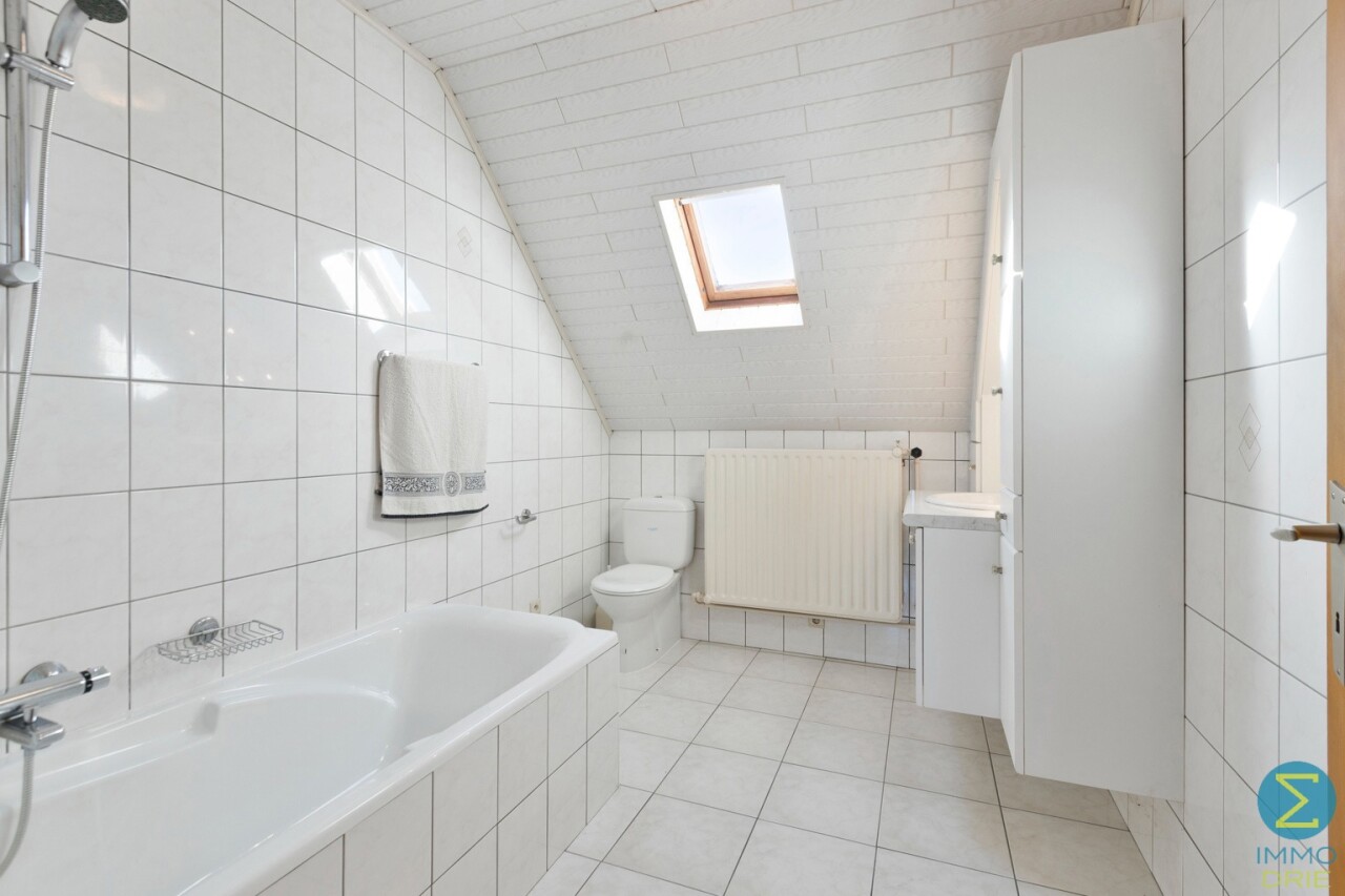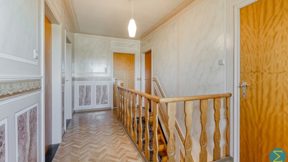 Op de verdieping treffen we de overloop met vier ruime slaapkamers en een badkamer met ligbad/douche, wastafelmeubel en toilet.