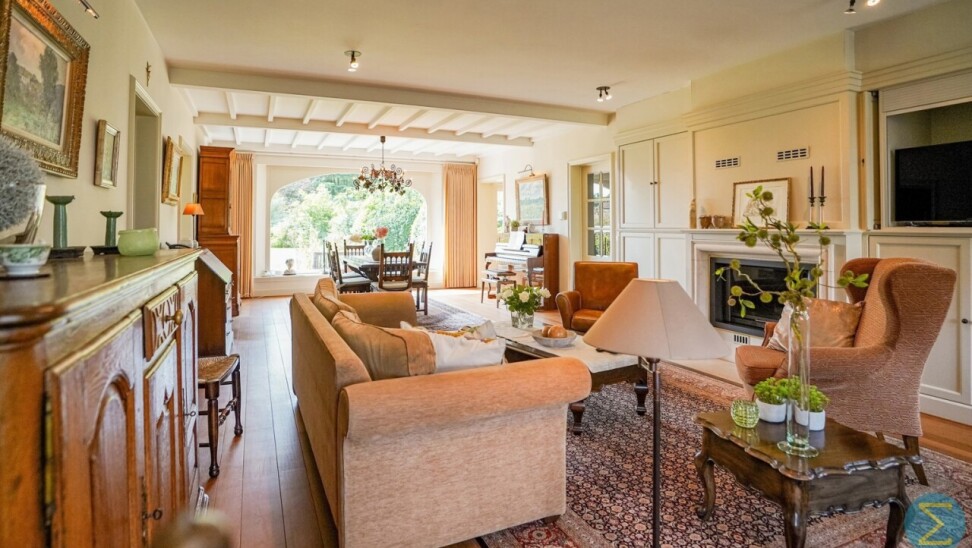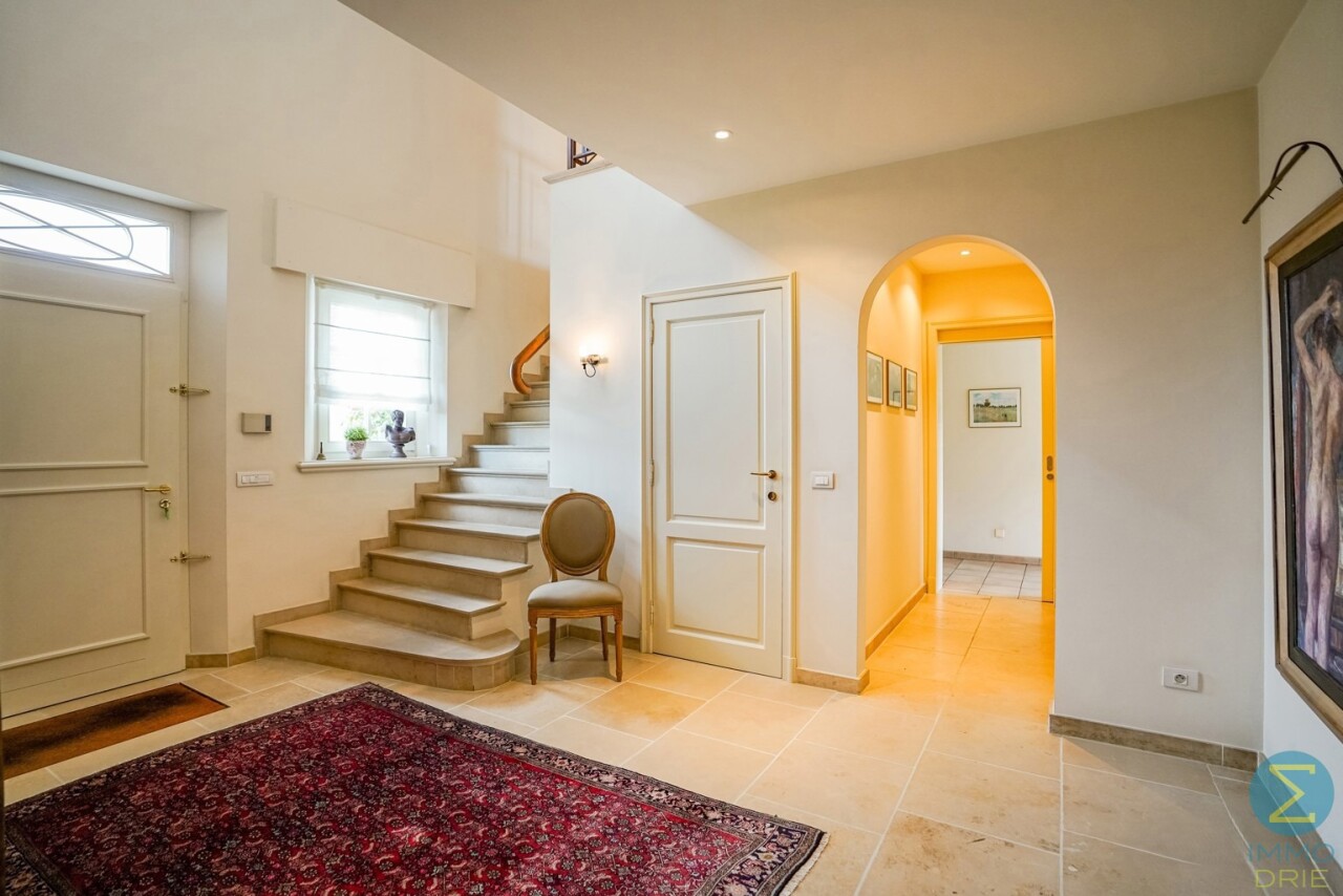 Via de royale inkomhal met imposante marmeren trap en vestiaire betreedt u deze stijlvolle woning. De ruime woonkamer met parketvloer en open haard ademt warmte en klasse uit, en biedt dankzij het grote raampartij een prachtig zicht op de verzorgde tuin. Aansluitend bevindt zich de gezellige tuinkamer, eveneens met tuinzicht, en een ingericht bureel – ideaal voor wie thuis werkt.