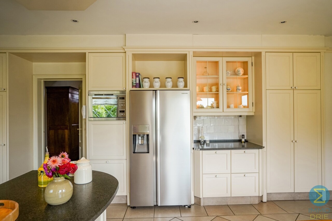 De volledig ingerichte leefkeuken met ontbijthoek is voorzien van alle comfort en grenst aan een afsluitbaar overdekt terras. Verder vindt u op het gelijkvloers een achterinkom met vaste kasten, ingerichte wasplaats met douche, koele berging en een inpandige dubbele garage met automatische poorten en veel opbergruimte.